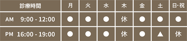 | PM 16:00 - 19:00 | ● | ● | ● | 休 | ● | ▲ | 休 |